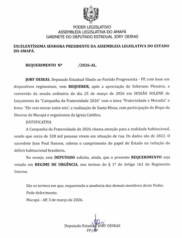 A Assembleia Legislativa do Amapá analisou e aprovou o requerimento que propõe a transformação da sessão ordinária do dia 25 de março de 2026 em sessão solene para o lançamento da Campanha da Fraternidade 2026. A proposta, de autoria do deputado estadual Jory Oeiras, destaca a importância do tema escolhido pela Igreja Católica: “Fraternidade e Moradia”, com o lema “Ele veio morar entre nós”.